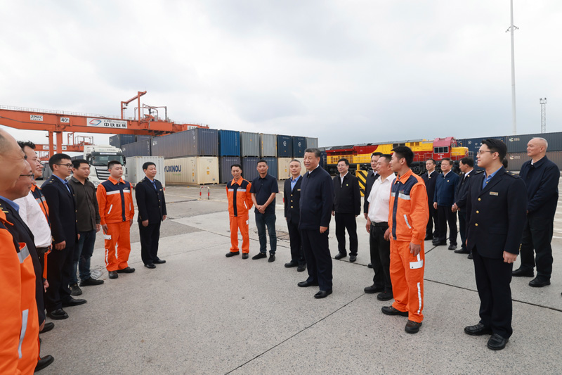 4月22日至24日,中共中央總書記、國家主席、中央軍委主席習(xí)近平在重慶考察。這是22日下午,習(xí)近平在重慶國際物流樞紐園區(qū)重慶鐵路集裝箱中心站,同貨車司機、列車司機、裝卸工人、場站管理人員等親切交流。新華社記者 岳月偉 攝